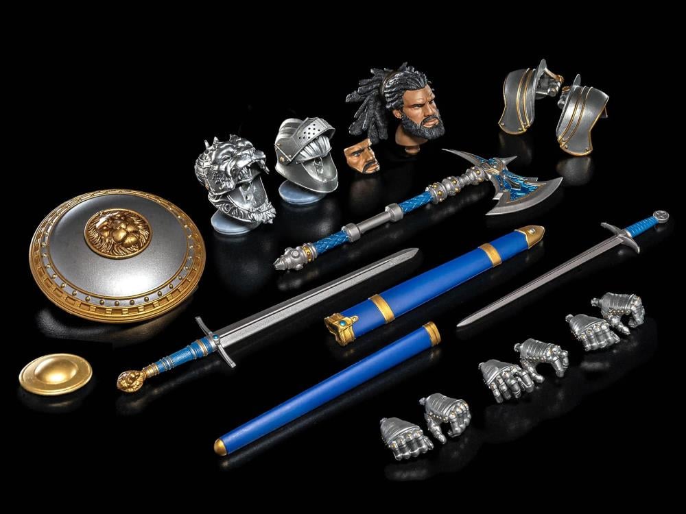 The Legacies of Mythoss: Otho figure comes with a newly sculpted head featuring this warrior’s distinctive look. The set also incudes 2 brand new helmets with flip-down visors, both of which can be used with the Otho “face plate” insert that is also included! As for weapons, Otho v2 comes with a broad sword and scabbard, standard sword and scabbard, a shield with 2 middle inserts (including a Leodysseus lion symbol), and a new battle axe. He also comes with extra hands and premium wired soft goods tunic and skirt.