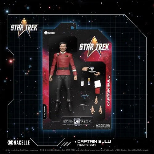Step into the captain's chair with this Captain Sulu action figure, representing the fearless and legendary officer of the U.S.S. Excelsior from Star Trek VI: The Undiscovered Country. As the captain of the Excelsior, Sulu is a seasoned officer with a deep sense of duty and unwavering commitment to Starfleet. This 1:12 scale, highly articulated figure captures his commanding presence with incredible detail. Included are a range of accessories that reflect both his leadership and more personal moments — like his iconic coffee cup and saucer. With two different phasers, two communicators from different Star Trek films, and the tools of a captain ready for any situation, this figure lets you recreate all the moments that made Captain Sulu a memorable character in the final chapter of the original crew's saga. This figure is a must-have for any Star Trek enthusiast or collector.