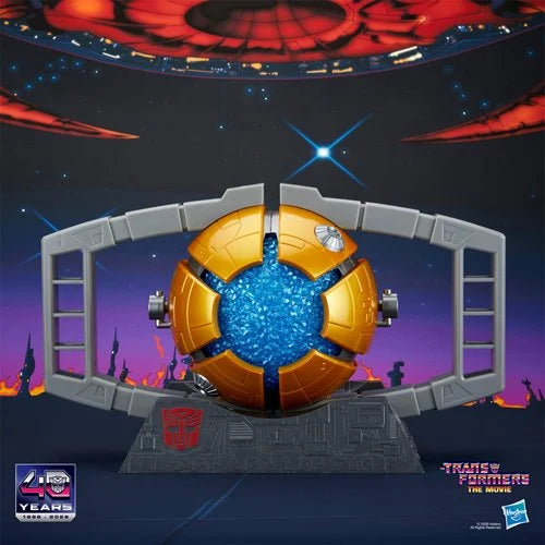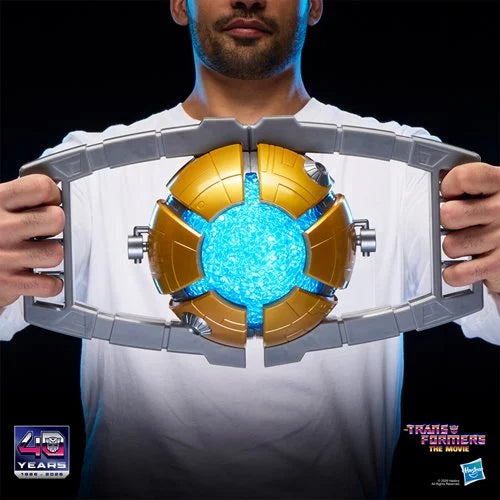 Celebrate 40 years of The Transformers: The Movie with an iconic, must-have collectible, The Matrix of Leadership! This impressive prop replica features an LED core with pulsing blue light for cinematic display. The extending frame allows for epic roleplay and open or closed display options. Pulsing with the power of Primus, the multi-faceted core features LED lights that shine brighter when the Matrix of Leadership is opened. It plays "The Touch" by Stan Bush, the memorable '80s anthem from the movie. Expand the frame and feel the power as the full song from the movie echoes through Unicron's insides! Or, you know, your living room. The optional stand makes for epic shelf display and works with the frame open or closed. Bonus points if you can spot all the Cybertronian Easter eggs!